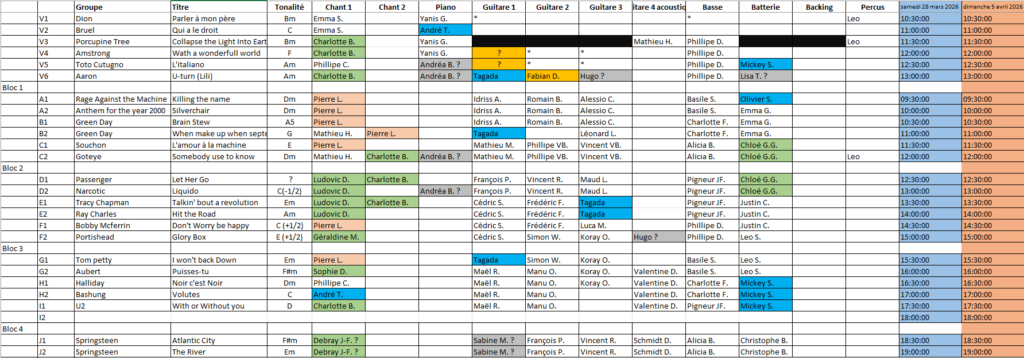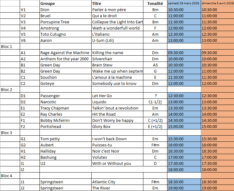 Merci également de vérifier vos disponibilités pour le concert. Certains morceaux seront jouer le vendredi 17 avril et d’autres le samedi 18 avril (la majorité) :